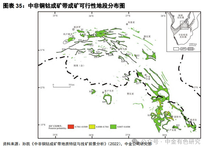 利卡西-科卢韦齐地区仍具备一定找矿潜力。据孙凯《中非铜钴成矿带地质特征与找矿前景分析》,其根据分形节点对成矿后验概率值进行分级,共划分出32处成矿可行性地段(远景区)。根据靶区圈定与资源量测算结果,刚果(金)利卡西-科卢韦齐地区不仅是资源集中区,而且仍具备较大成矿潜力。