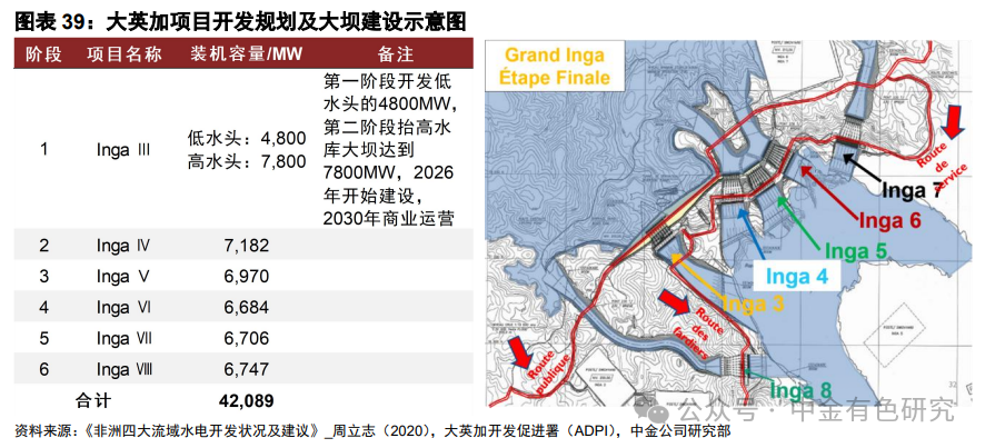 二是在已规划的水电项目中,我们统计的9个项目总装机容量达1.1万兆瓦,是目前刚果(金)已建成项目容量的3倍以上。另外据大英加开发促进署(ADPI)给出的大英加项目规划,将新建累计6座水电站,装机容量共计超4万兆瓦,且为了加快进度,项目设计方案允许各期独立开发,首期Inga Ⅲ项目规划于2026年开始建设,预计2030年投入商业运营。