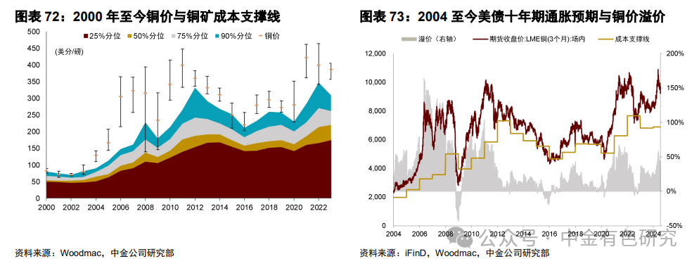 展望未来,高通胀时代下的地缘政治风险抬升或推升铜价溢价水平。我们认为,一是地缘政治风险不断抬升,或提高矿企对海外资产运营的收益率要求,二是从历史复盘来看,美债十年期通胀预期与铜价溢价水平趋势整体一致,但2023年以来出现了一定程度的偏离,这样的偏离背后反映了铜矿的生产成本已至历史最高,对应的成本支撑线抬升,但铜价受到美联储连续大幅加息的压制,并未追随成本支撑线上涨而上涨。因此我们认为,在降息交易开启后,铜价的溢价水平或重新向通胀预期趋势看齐。