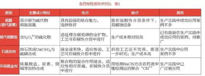 硫脲、硫代硫酸盐、石硫合剂及铁氰酸盐添加尿素和烧碱类化工试剂配制而成的环保提金剂等可以浸金是毋庸置疑的,纵观此类浸金剂即有非常相似之处,又各有不同的特点和差异,各药剂性质特点对比详见表1。