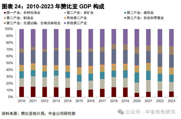赞比亚经济发展相对于刚果(金)更为多元化。根据世界银行,赞比亚2023年名义GDP为282亿美元,同比-3%;人均GDP为1369美元,在当年统计的203个地区中排第178名,约为全球平均水平的10%。从GDP构成来看,据赞比亚统计局数据,2023年赞比亚第一、二、三产业GDP占比分别为8%、35%、57%,其中批发零售业,采矿业,交通运输、仓储邮政业为前三大GDP贡献产业,占当年GDP比例分别为19%、14%、12%。