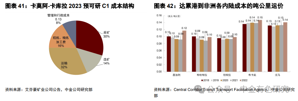 根据中金交运物流组测算,非洲内陆段物流成本占比或过半。非洲内陆段指从刚果(金)矿区陆运到港口,物流成本最主要包括内陆运输费用(主要是公路的运输费用和过关过境的费用)。根据Central Corridor Transit Transport Facilitation Agency[19,20]和中金交运物流组测算,我们预计2022年非洲内陆吨公里的物流成本为0.10-0.12美元/吨公里,对应非洲内陆段单吨物流成本为247–367美元,占全链路物流成本的45%-67%。
