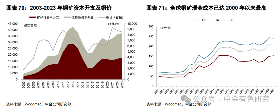 二是全球铜矿生产成本抬升,已触及2000年以来最高位。2023年全球铜矿生产成本已触及2000年以来最高位,据Woodmac,2023年全球铜矿平均C1[25]现金成本为3616美元/吨,为2000年以来最高。若我们考虑折摊及其他间接成本,C3现金成本同样位于历史最高区间内。2023年全球铜矿平均C3现金成本已达5553美元/吨,同样为2000年以来最高位。