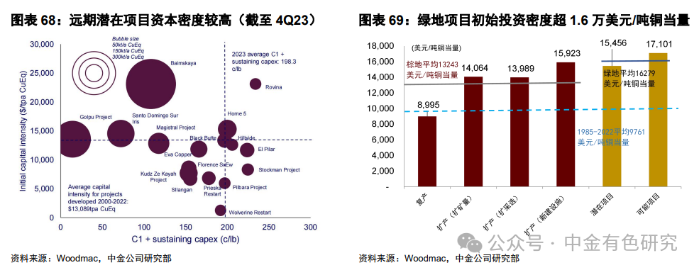 一是远期潜在项目资本密度不断抬升。据Woodmac,截至2023年,棕地项目扩产及停产项目复产所要求的初始投资密度均值为13,243美元/吨铜当量,而绿地项目的均值已达16,279美元/吨铜当量,较1985-2022年的均值9761美元/吨铜当量大幅抬升。若我们考虑远期的潜在项目,其所要求的资本密度也大多高于2000-2022年的均值13,089美元/吨铜当量。我们认为这或与新增项目品位降低、开采条件恶化以及ESG要求愈发严格等因素有关。
