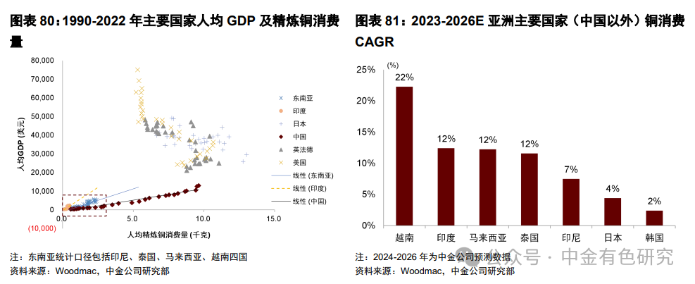 第二,从地域层面,东南亚与南亚有望受益于产业转移、经济增长、城市化进程加快以及清洁能源领域的突破等,开启新的铜需求超级周期。据Woodmac测算,南亚及东南亚2023-2026年精炼铜需求量CAGR为12%,其合计全球需求占比或从2022年的7.18%达到2026年的9.63%,对应的需求CAGR贡献约为0.95%。[ CAGR贡献度计算同上。]