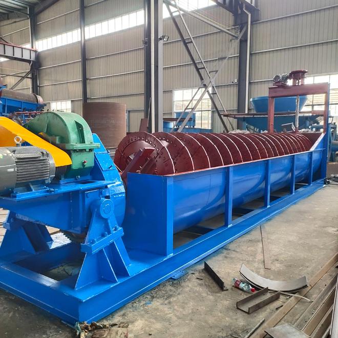 螺旋洗矿机由槽体、螺旋叶片、传动装置及排矿口组成。其工作原理是通过螺旋叶片旋转推动矿石前进,同时借助水流冲刷和机械搅动剥离矿石表面黏土。
