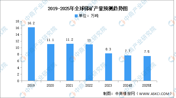 近年来,全球锑矿产量呈现下降趋势。中商产业研究院发布的《2024-2030年中国锑市场调查与行业前景预测专题研究报告》显示,2023年全球锑产量达8.3万吨,同比下降24.55%。中商产业研究院分析师预测,2024年全球锑产量将继续下降至7.7万吨,2025年预计产量为7.5万吨。